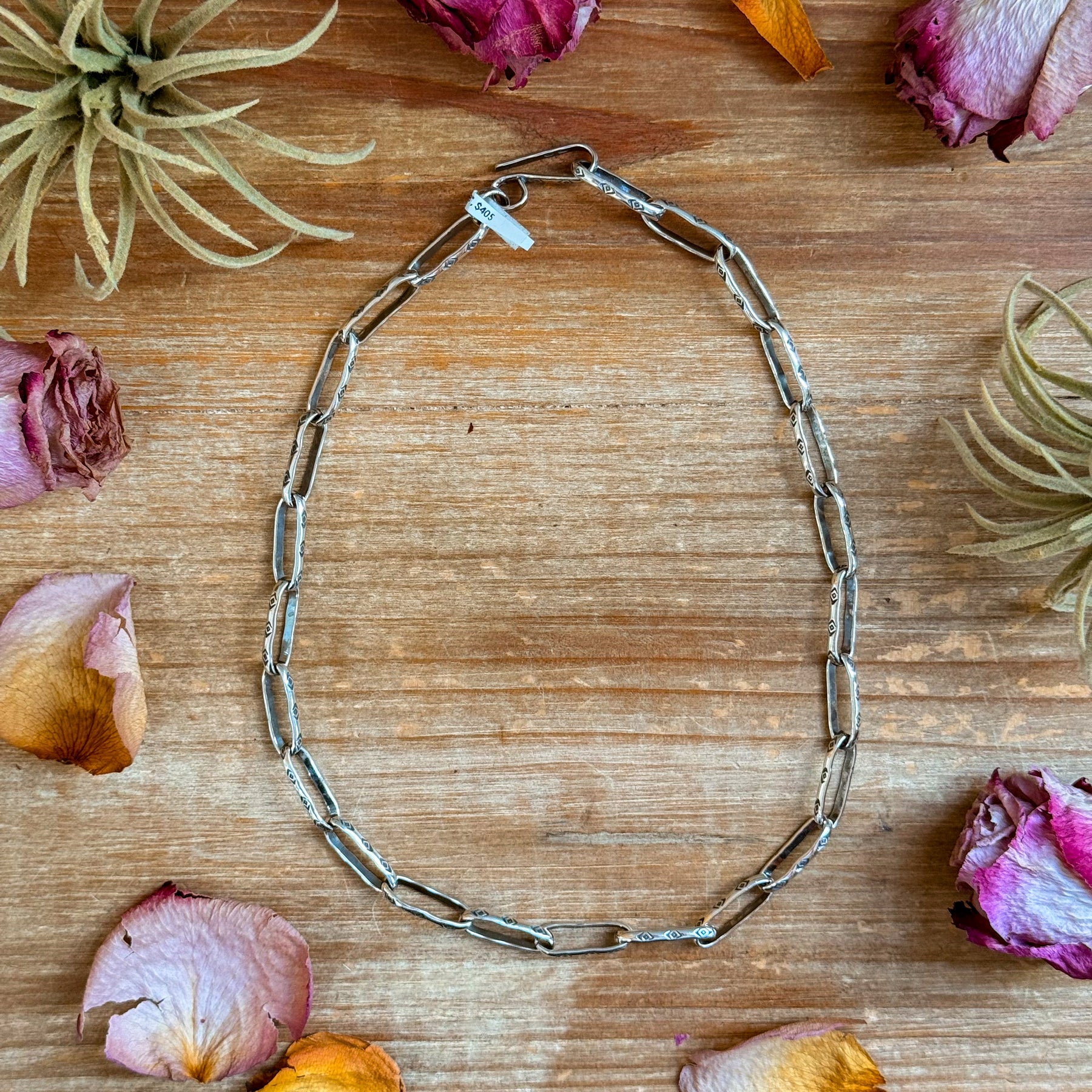 This bold sterling silver chain by artist Jason Ogg features a distinctive Medicine Man Eye pattern along each large paperclip link. Handcrafted and finished in the USA, this 18-inch chain blends clean silversmithing with traditional Western detailing. The solid silver construction gives it a luxurious weight while remaining comfortable for everyday wear.