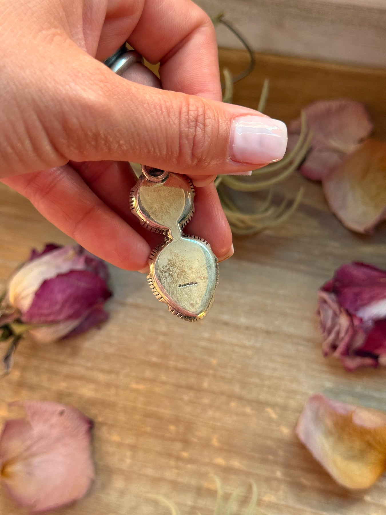 Measuring approximately 2½ inches long by just under 1 inch wide, this pendant is lightweight yet full of presence. The 8 mm bail fits most chains, pearls, or heishi necklaces. Each stone is unique, with natural variations in shade and matrix pattern, making every pendant one-of-a-kind.