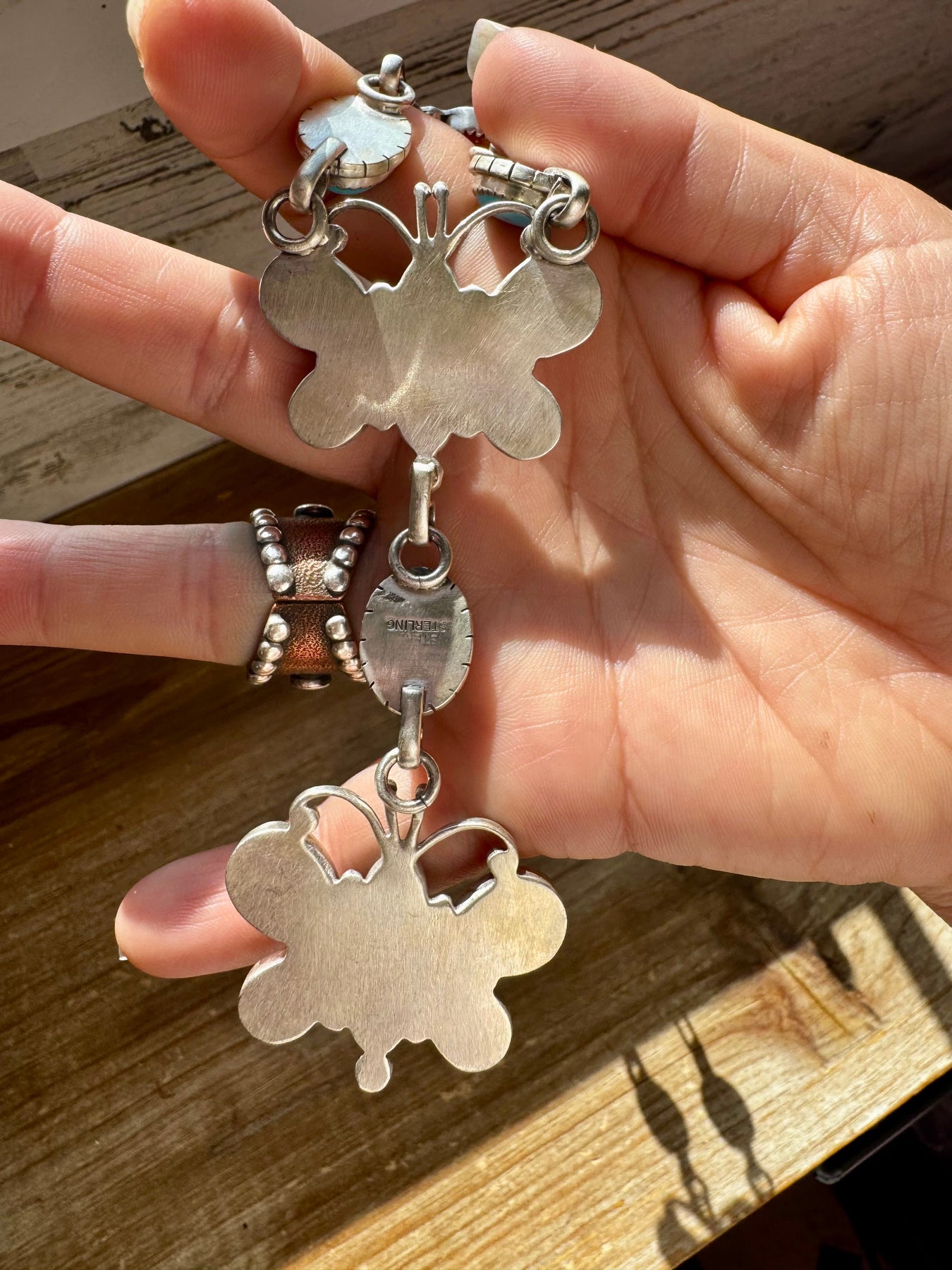 A breathtaking statement piece featuring six beautifully detailed sterling silver butterflies, each set with Kingman turquoise and spiny oyster. This USA-made necklace is strung on a 32.5-inch paper clip sterling silver chain with a dramatic 4-inch drop. The contrast of vibrant turquoise and deep spiny oyster adds a warm, earthy elegance. Truly one-of-a-kind, it’s a wearable piece of art that brings bold character to any outfit.