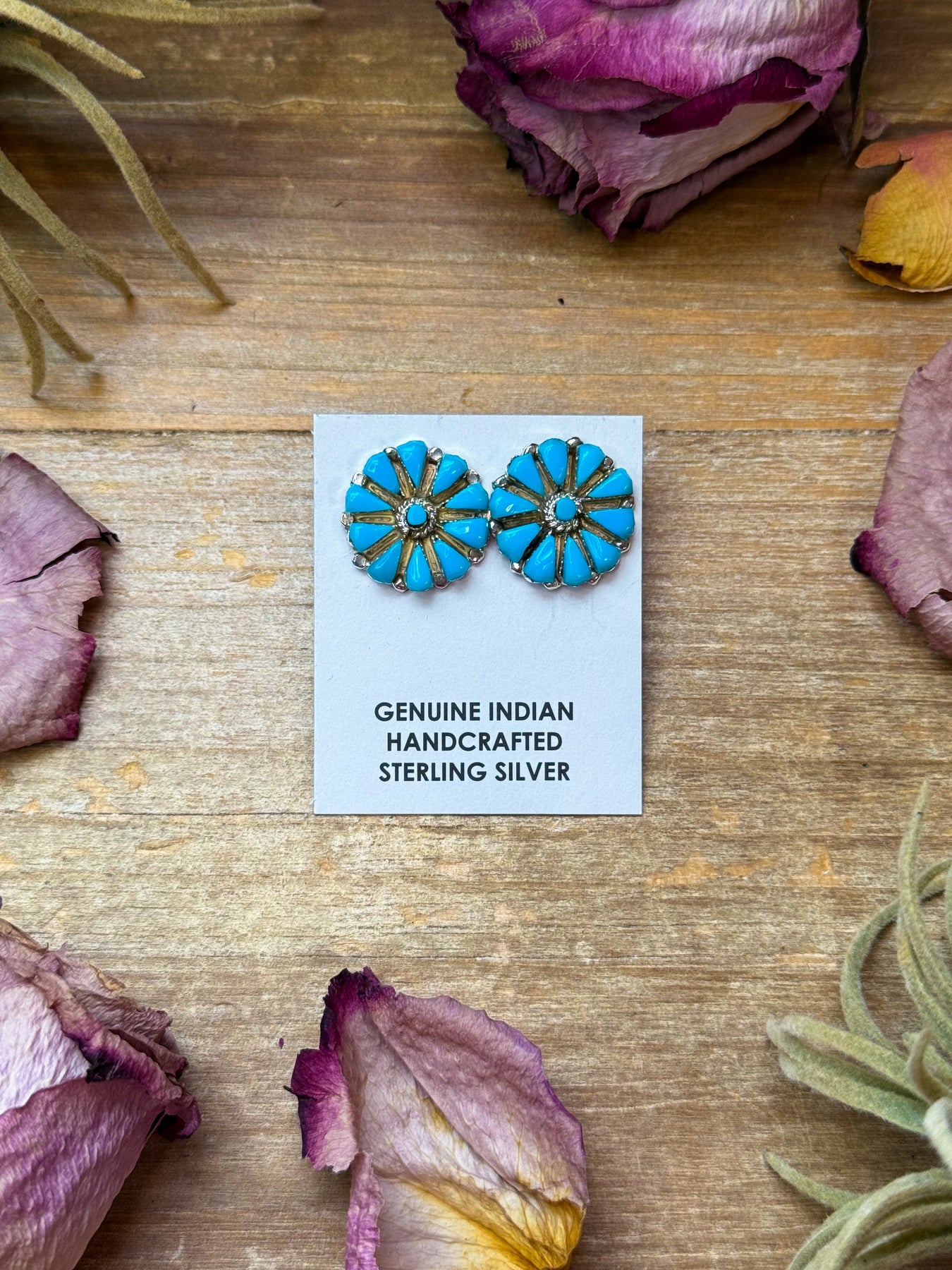 Each earring features bright blue Magnetite Turquoise — some stones with gold-toned matrix lines — arranged in a classic cluster design that bursts with color and Southwestern charm.