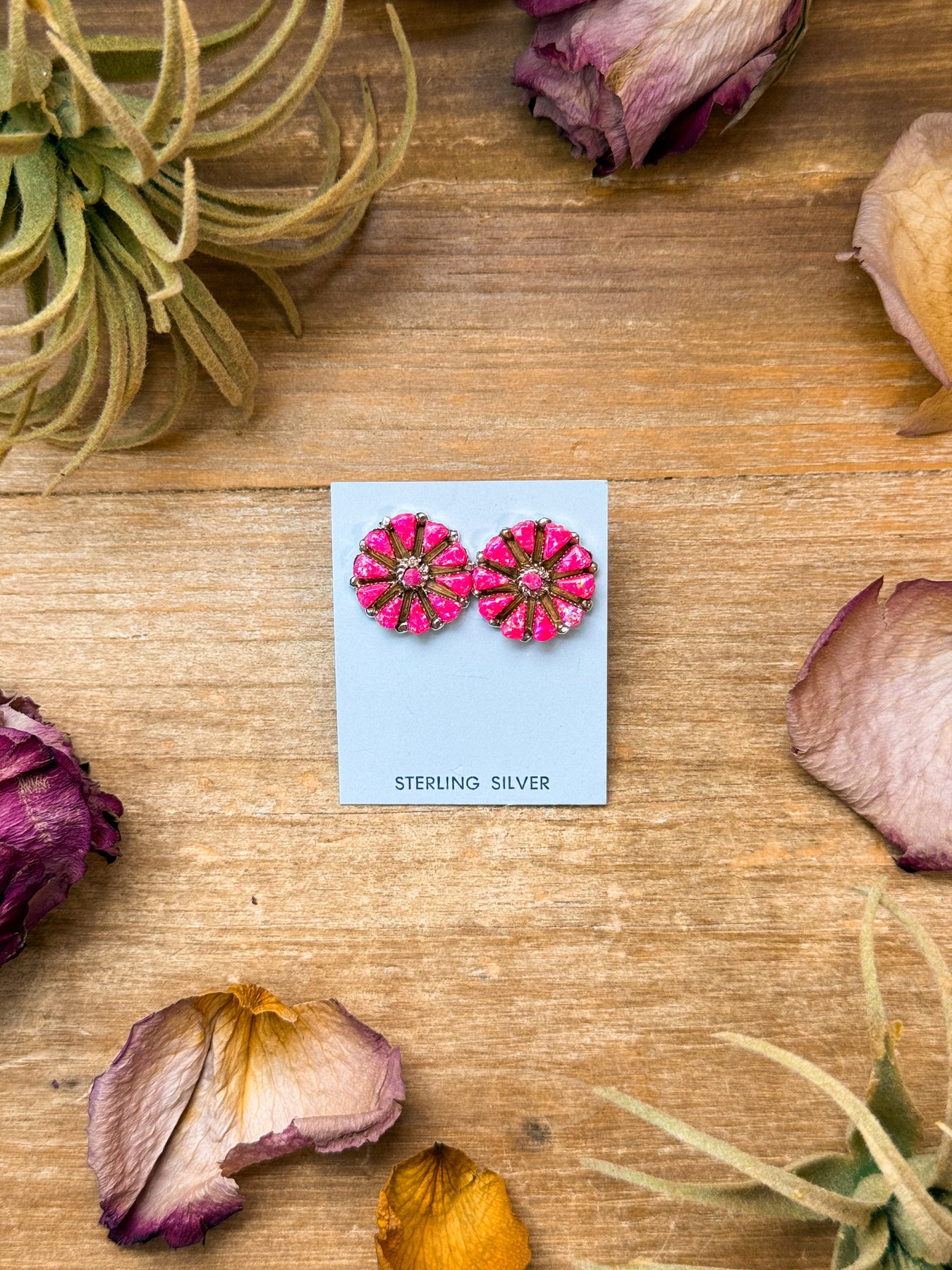 These pink opal cluster earrings are Native made and beautifully handcrafted in sterling silver by artist S.C. Each pair is stamped “S.C.” and “Sterling,” featuring soft pink opal stones arranged in a classic cluster design. The post-in-the-middle setting offers a balanced and comfortable fit. Every pair is unique in color and pattern, making these earrings a one-of-a-kind expression of Southwestern elegance.