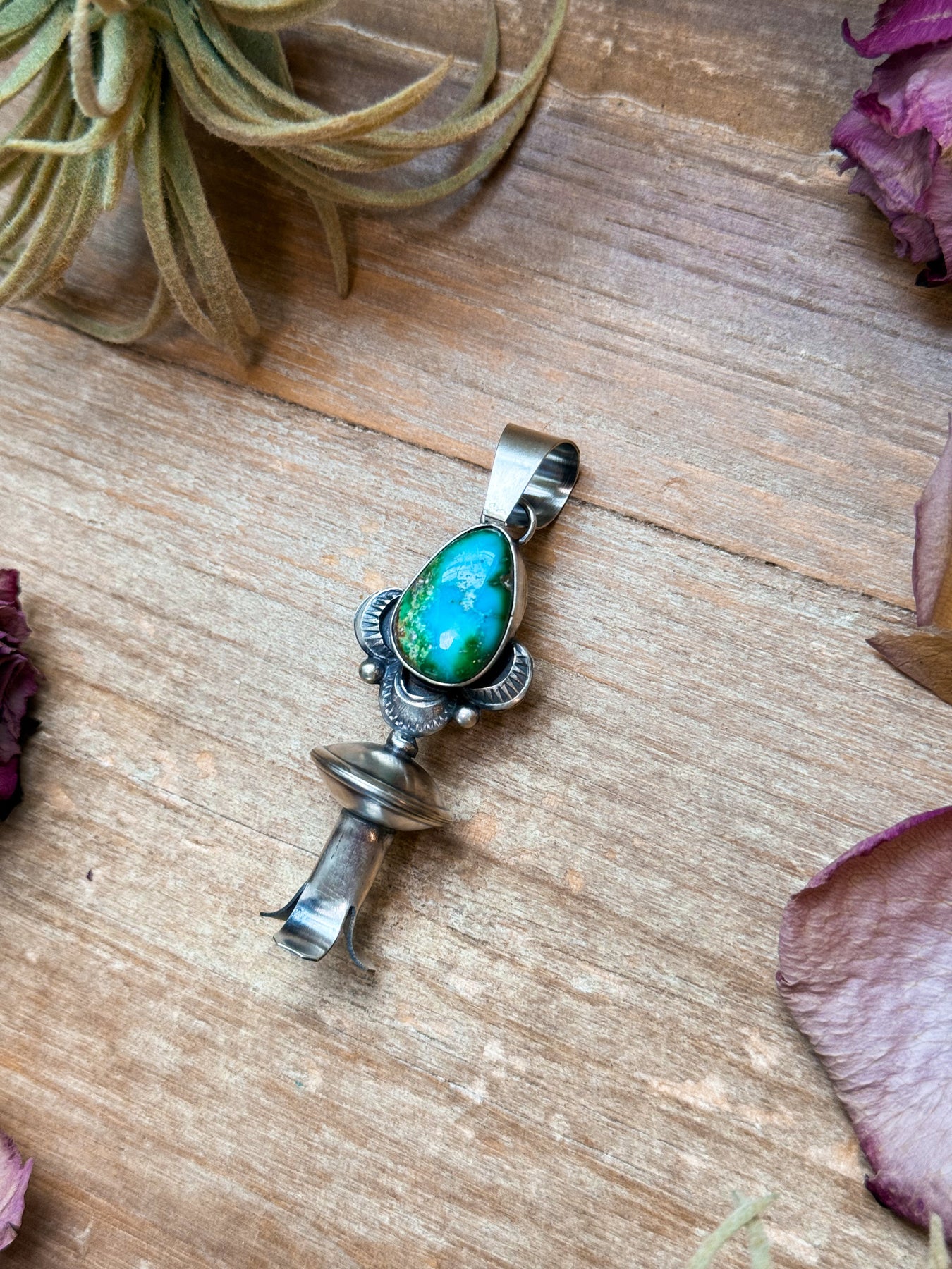 This blossom-style pendant features a genuine 8 mm Sonoran Gold turquoise stone set in sterling silver. Native made by artist “M” with an arrow hallmark, this piece highlights the vibrant blend of green, blue, and golden hues that make Sonoran turquoise so distinctive. Stamped “Sterling,” each pendant is handcrafted and completely one of a kind — a perfect piece for collectors or anyone who loves classic Southwestern jewelry.