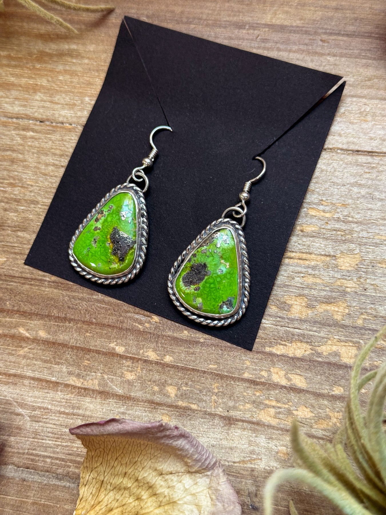 These elegant Sonoran Turquoise dangle earrings are handmade by silversmith Jason Ogg in solid sterling silver, featuring genuine Sonoran Turquoise stones with their signature blue-green tones and warm golden matrix. Every pair is stamped “Sterling” and marked with Jason Ogg’s artist hallmark, reflecting his exceptional Southwestern craftsmanship. Lightweight, eye-catching, and timeless — these earrings are perfect for everyday wear or to elevate a special outfit.