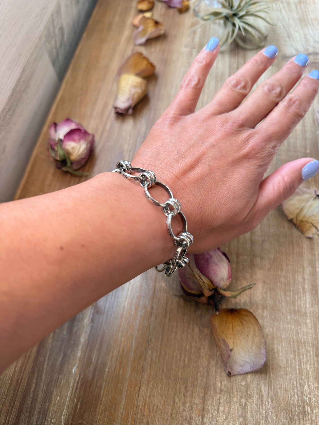 This sterling silver charm chain bracelet by artist Jason Ogg features the signature Medicine Man Eye pattern hand-stamped along each link. Designed to fit a 7-inch wrist with a 2-inch extender, this piece combines durability with timeless Western detail. Each link is individually crafted and polished for a clean, bright silver finish — perfect for wearing alone or adding your favorite charms.