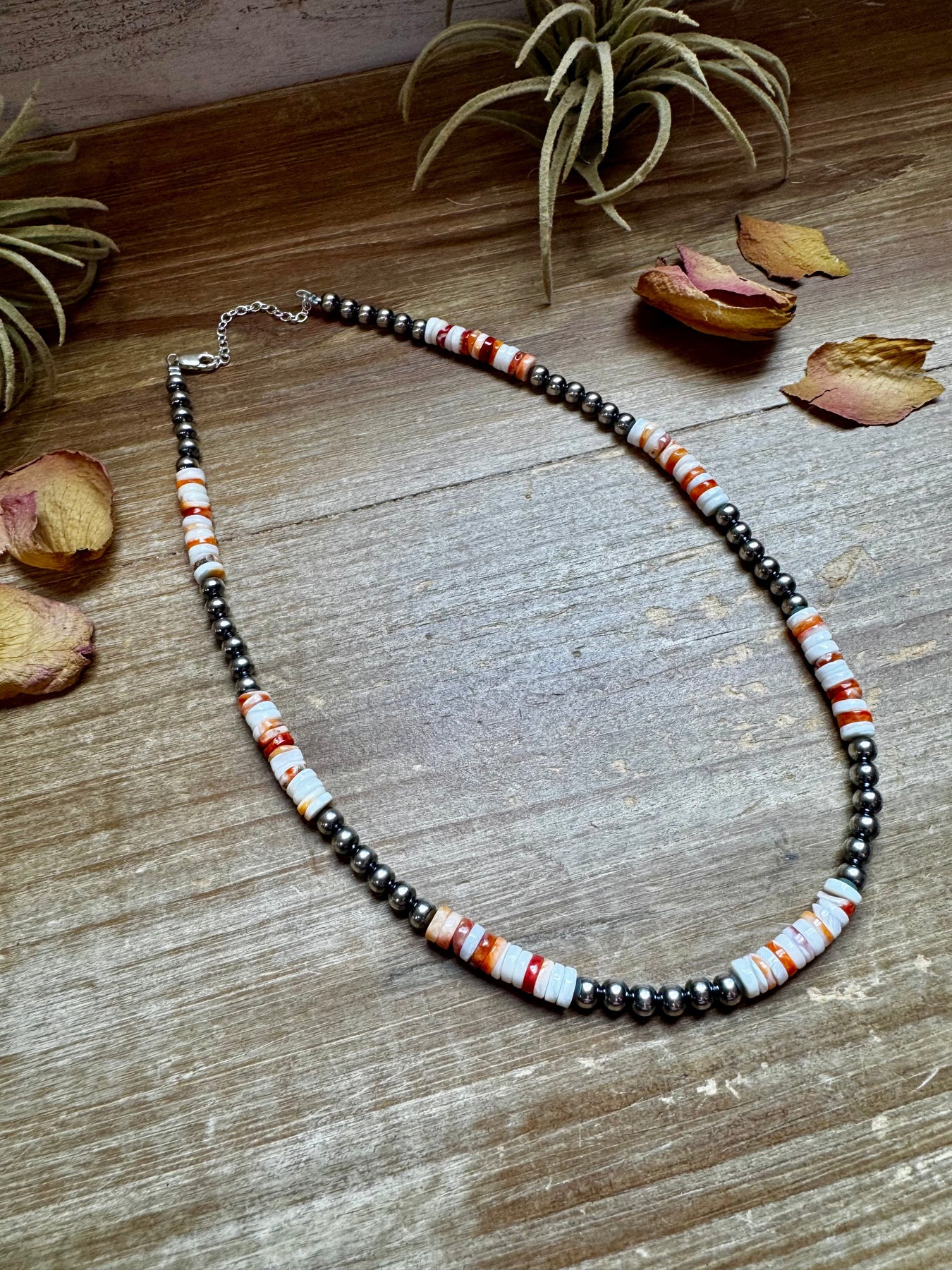 This 17-inch necklace is handmade by us in North Texas, featuring a balanced mix of 5 mm sterling silver pearls and spiny oyster beads in beautiful orange and white tones. We alternated 6 pearls and 6 spiny oysters to create the perfect beachy, summer-ready look.