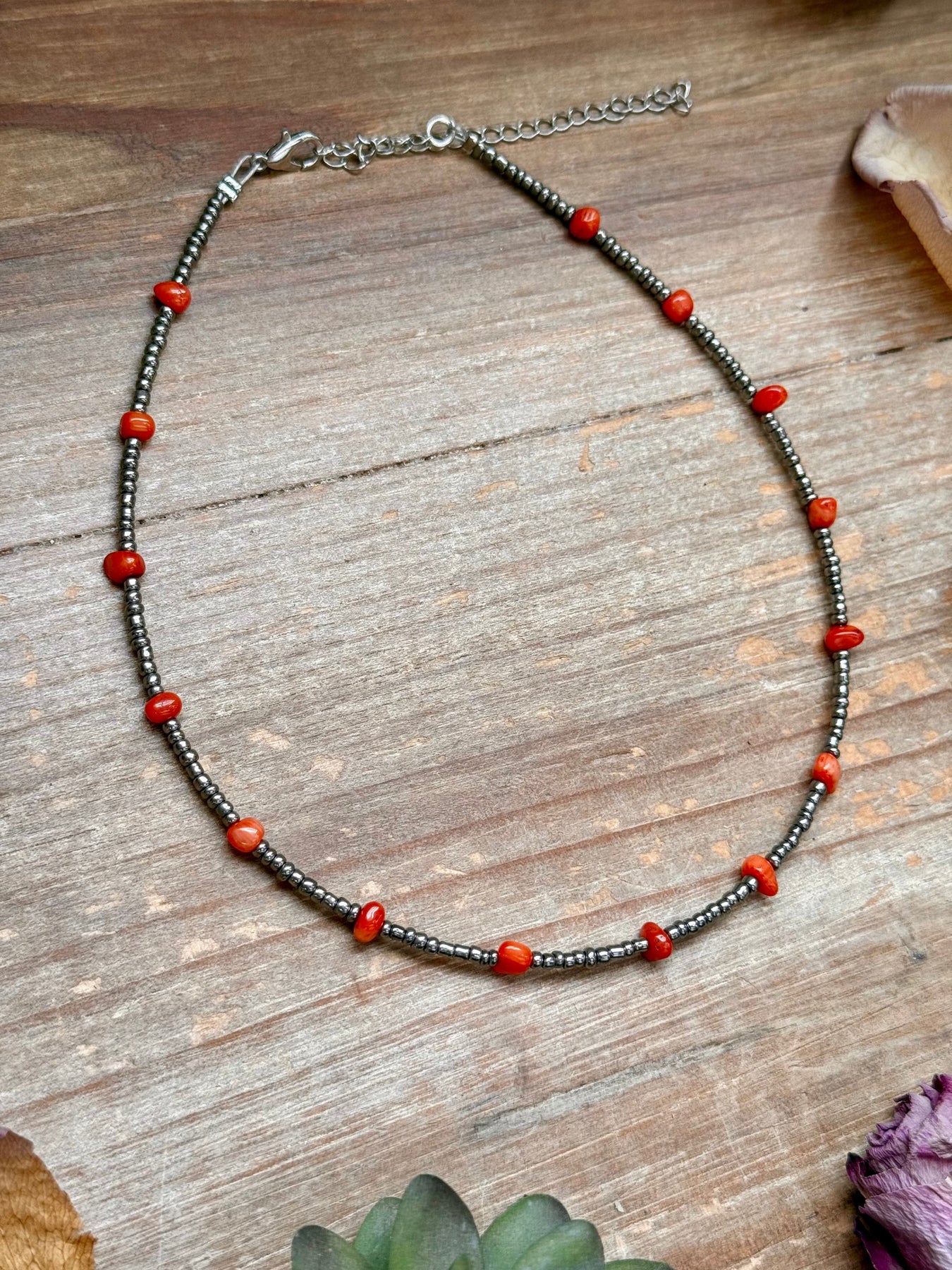Designed with antique silver seed beads and rich red coral accents, this 14-inch choker adds the perfect pop of color and texture to any outfit — from Western fashion to everyday casual looks.
