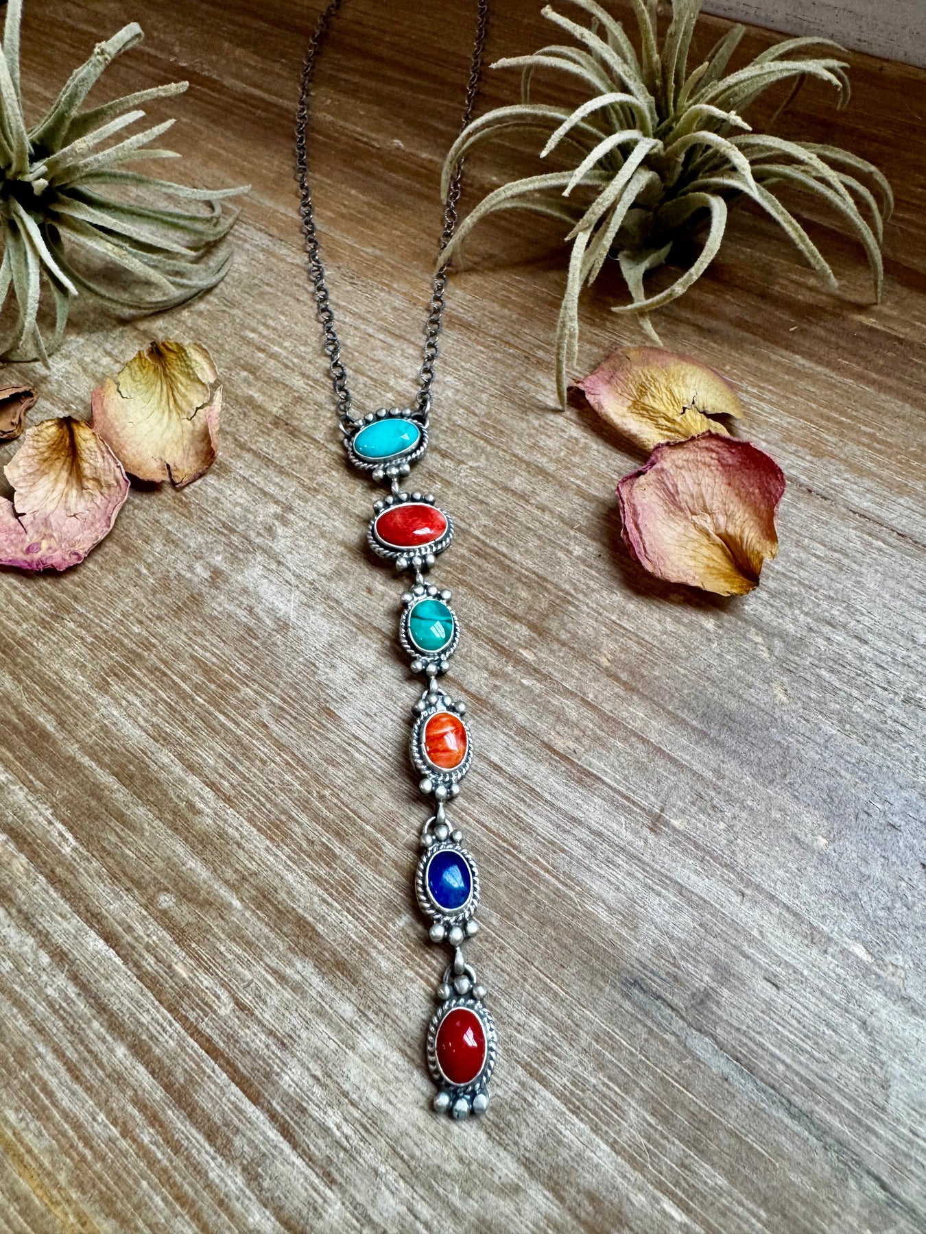 This one-of-a-kind lariat necklace is Native handmade and features six stunning charms—a bold mix of turquoise, spiny oyster, and lapis set on a sterling silver chain. With an 18-inch chain and a dramatic 5-inch drop, this statement piece brings color, texture, and movement to your neckline.