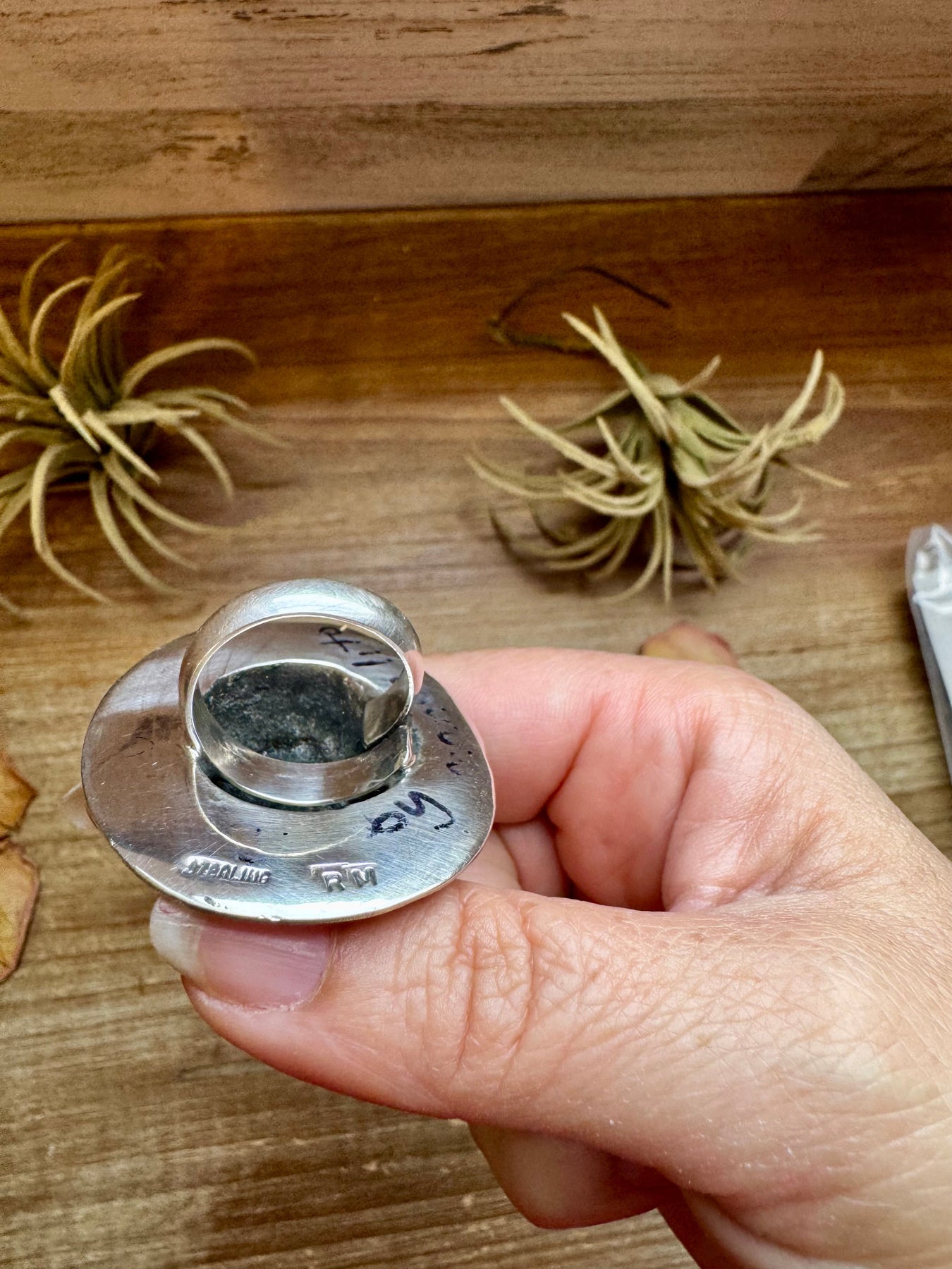 One of a kind and full of character. This sterling silver adjustable ring is handcrafted in the shape of a cowboy hat, complete with intricate feather detailing and a bright Kingman turquoise stone in the center. Made by Navajo silversmith Robby Manuelito and stamped “R.M.”