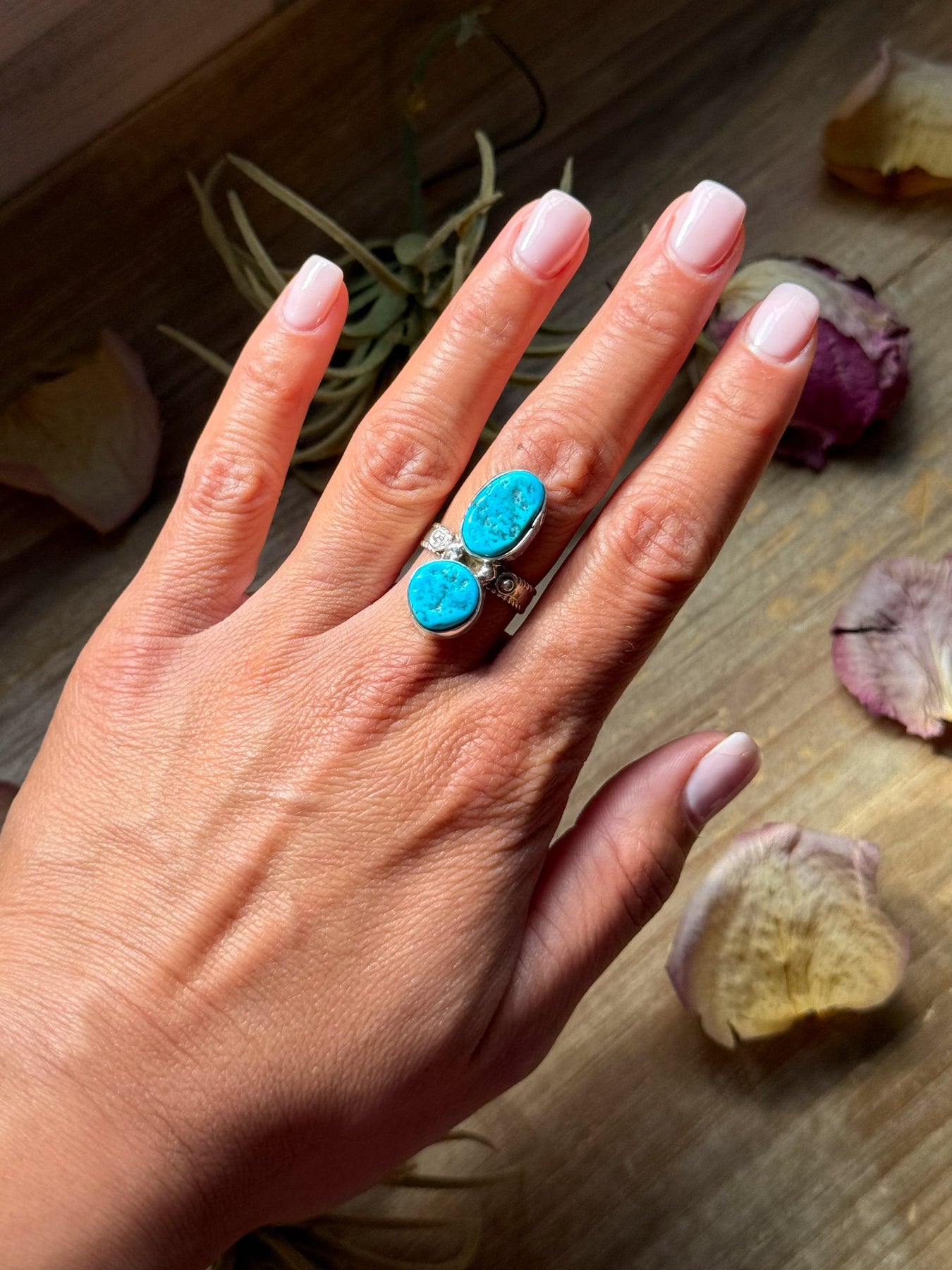 Made in the USA, this sterling silver ring showcases genuine Kingman turquoise stones set in a beautifully textured silver design. Each stone displays the natural sky-blue tone and matrix pattern Kingman turquoise is loved for.