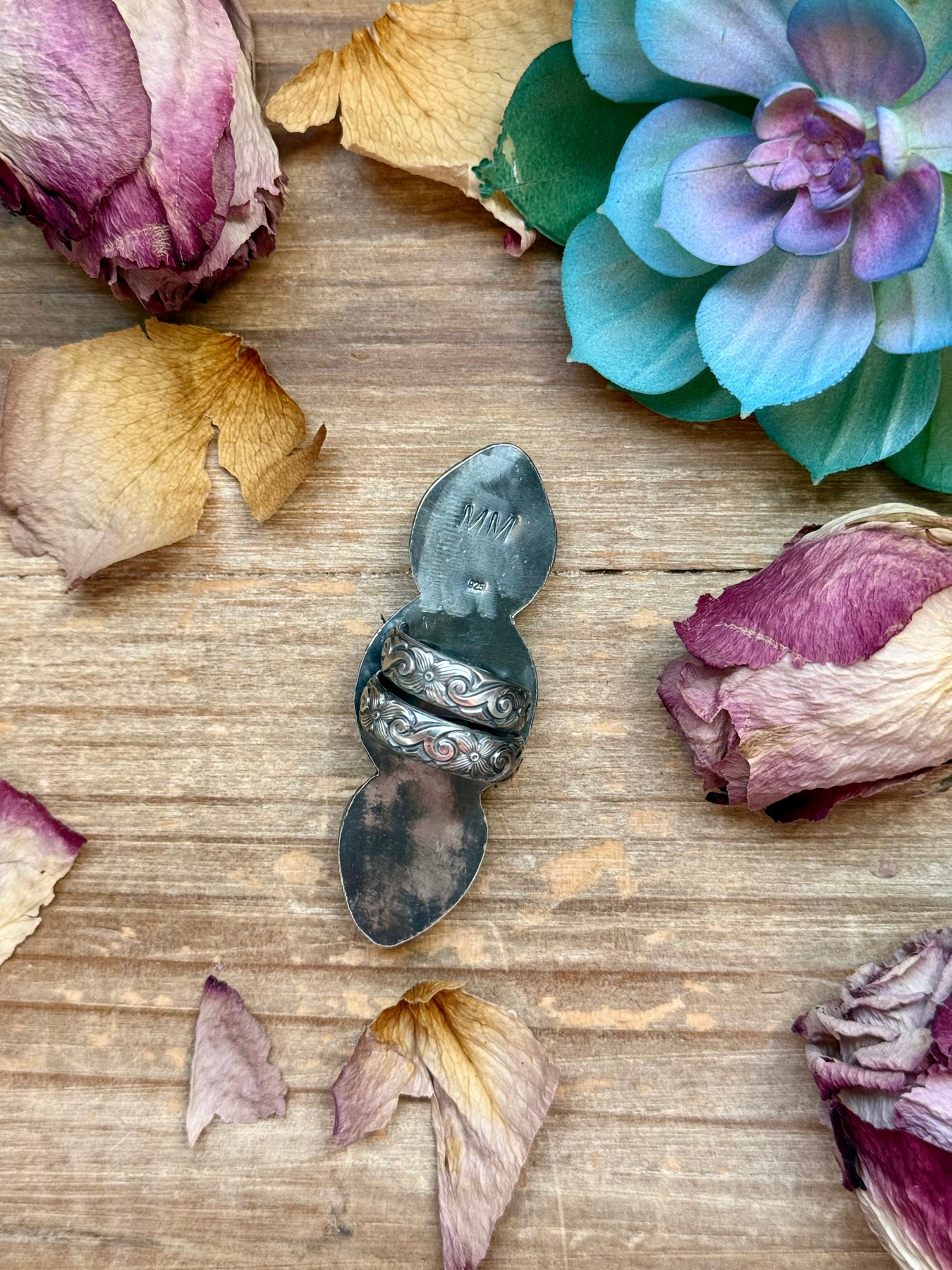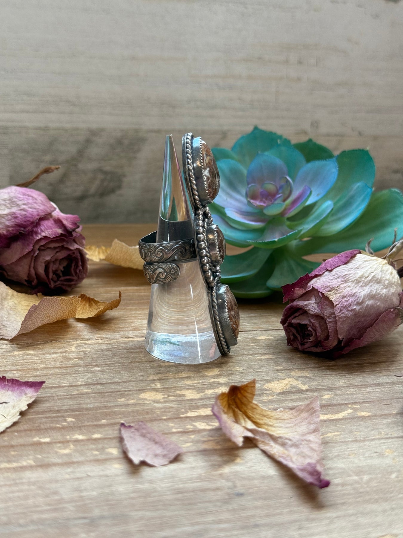 This stunning Wild Horse ring is designed and created right here by our in-house silversmith at The Bijoux FAB. It features three beautiful Wild Horse stones set in solid sterling silver with a gorgeous handcrafted design. The band is adjustable, making it easy to get that perfect fit while still feeling sturdy and comfortable. Every ring is truly one of a kind — made with love, intention, and American craftsmanship.