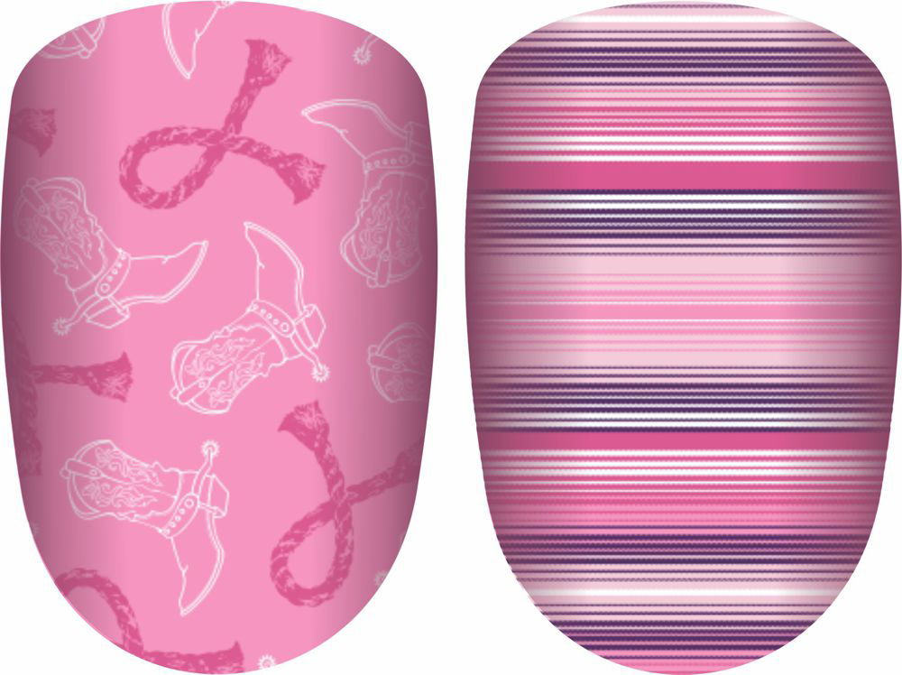 18-piece real nail polish strips feature pink/purple/white serape print nails alternating with and white boots and a dark pink rope ribbon on a pink background.